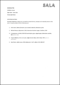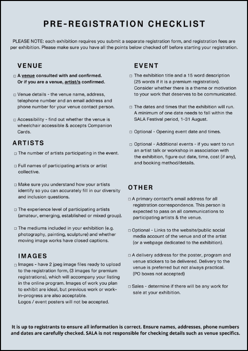 To be part of the SALA Festival, an art event needs to be registered. This is done by completing the online Registration form and paying the registration fee.